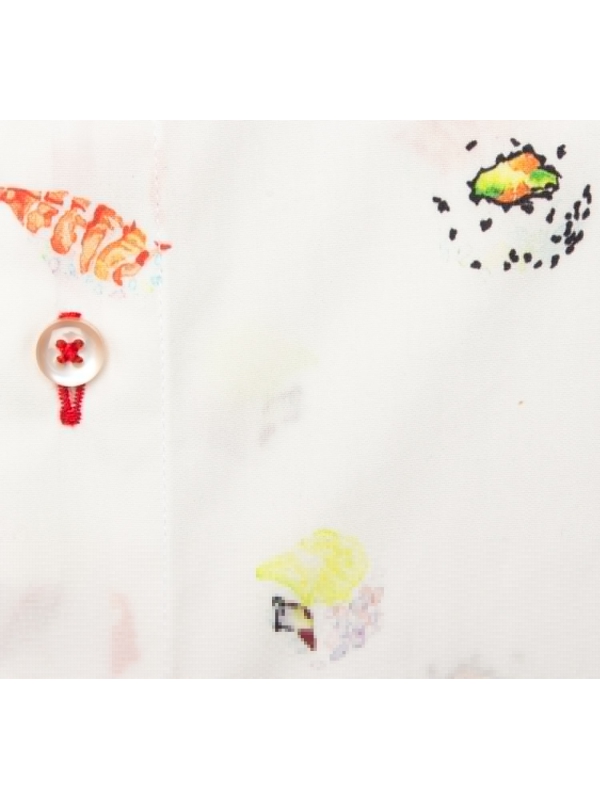 Look on the yummy side of life with this tasty shirt’s pop sushi prints. With its slightly acid colours, it will enhance a black blazer and go beautifully with raw denim jeans. Its slim-fitting cut, its Milanese collar and simple cuffs make it a flawlessly chic style.